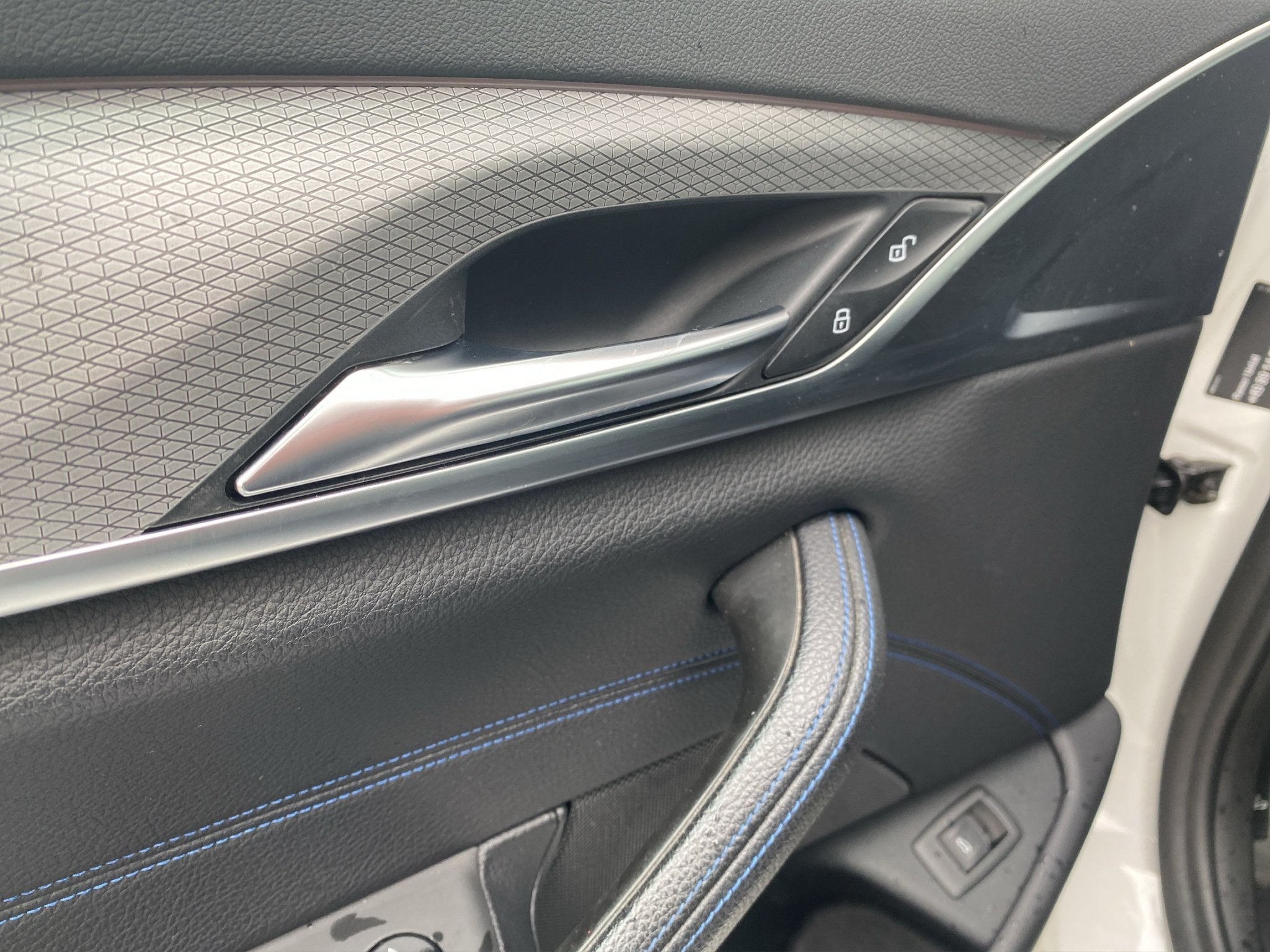 • BMW i Logo mit blauer Linie und stilisiertem silbergrauen „i“.