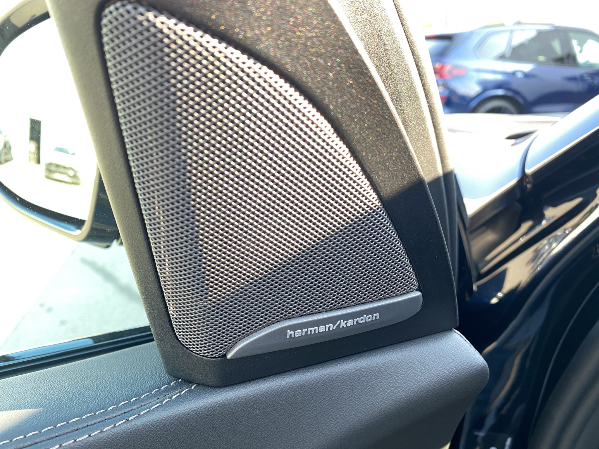 • BMW i Logo mit blauer Linie und stilisiertem silbergrauen „i“.